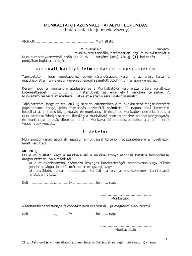 Munkaltatoi Azonnali Hatalyu Felmondas Minta Mediastart Online