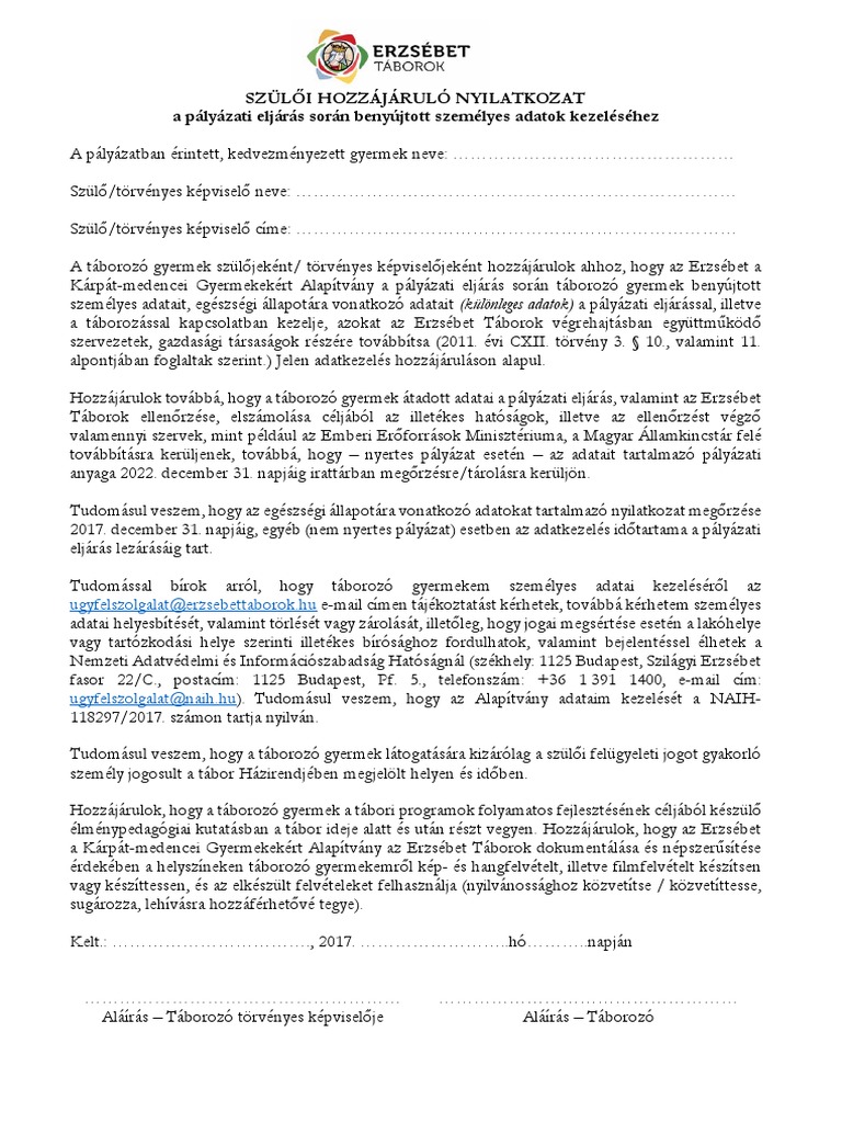 Szuloi Adatkezelesi Hozzajarulo Nyilatkozat Taborozashoz Mediastart Online